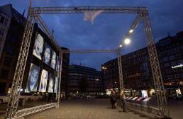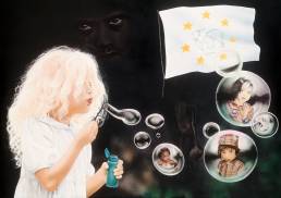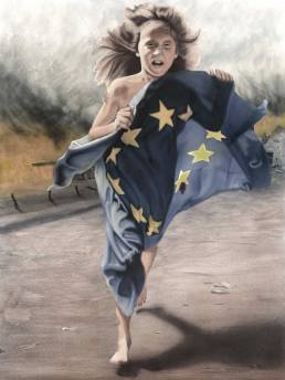 So entstand „Europa – deine Kinder“, ein ergreifendes Werk, inspiriert von einem der berühmtesten Anti-Kriegsfotos. Auf diesem Bild flieht ein Kind nackt vor den Grauen des Krieges und sucht Schutz in Europa. Doch auch Europa, symbolisiert durch die Europaflagge, hat bereits Feuer gefangen.