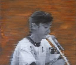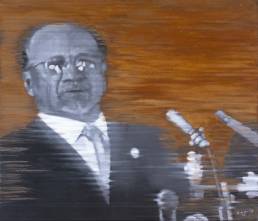 Dies und die beiden folgenden Gemälde zeigen eine Verzerrung ähnlich einer Zeilenstörung auf einem analogen Fernsehbildschirm. Diese Verzerrung steht symbolisch für die potentielle Verzerrung der Wahrheit im Fernsehen und anderen Medien. Es ist eine kraftvolle Allegorie für die Herausforderungen, denen wir in unserem Informationszeitalter gegenüber stehen.