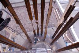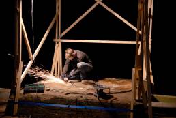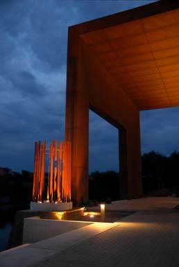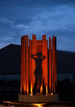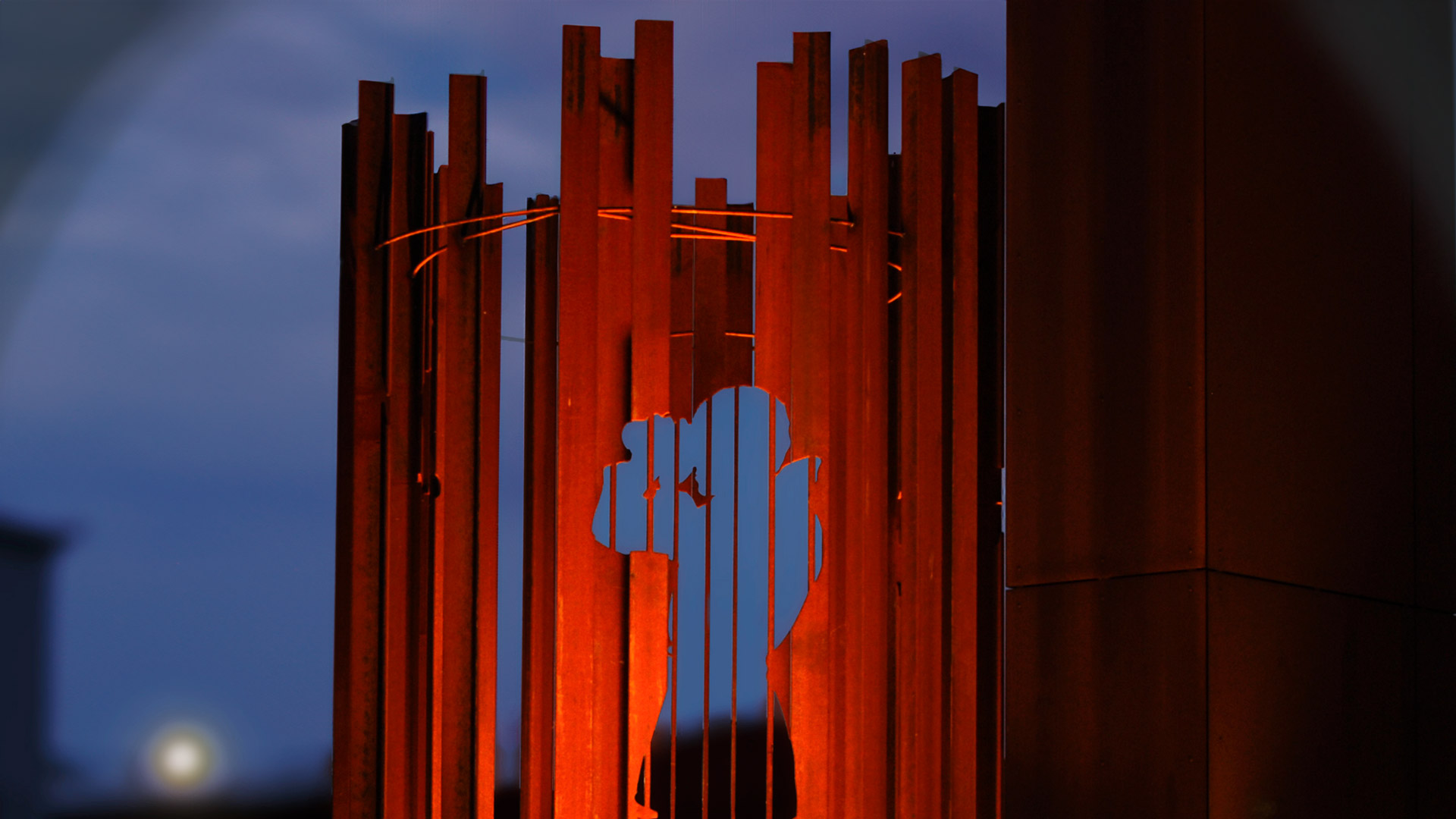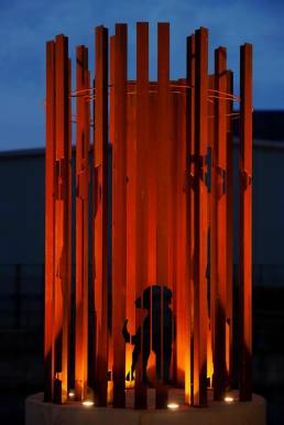 Manchmal ist es sinnvoll den BLICKPUNKT zu wechseln, um zum Kern der Dinge vorzudringen Skulptur „Blickpunkt“ 2016, Hamburg Wilhelmsburg, Jaffestraße 12 26 T-Träger aus Stahl, 3,30 Meter Höhe auf 60 cm Betonsockel, montiert auf einem historischen Kransockel, 2,6 x 2,6 Meter. Vorherige GalerieNächste Galerie